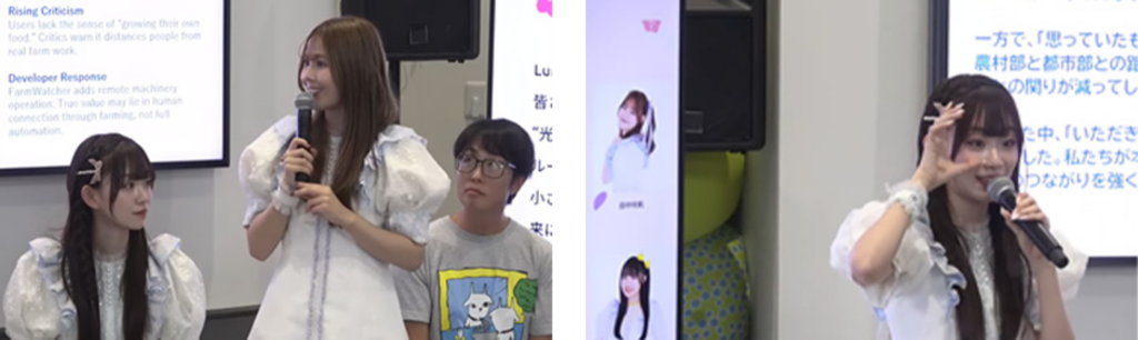 ワークショップの発表をするLumiUnion田中咲帆さん、未来の技術を説明するLumiUnion雪月心愛さん